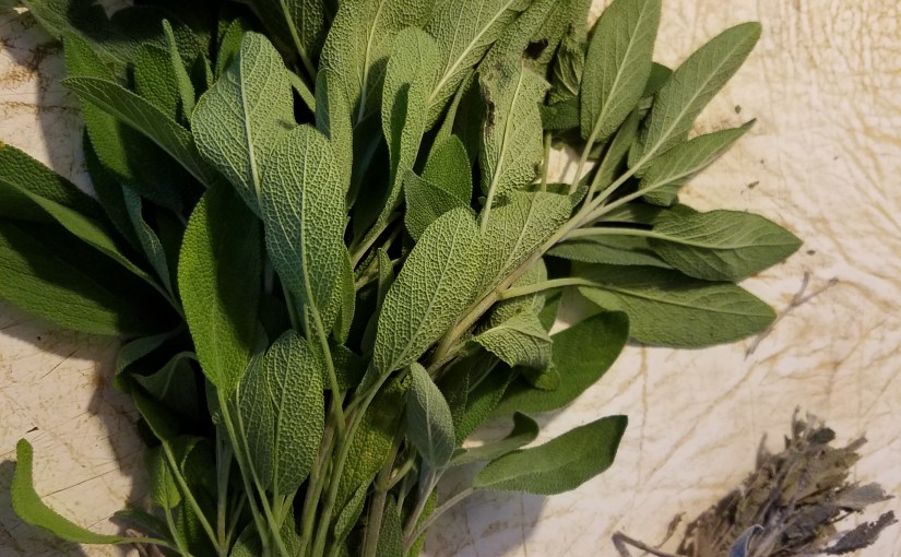 Drying sage is so easy too. I wash it after I harvest it, rubber band a bunch together then hang it upside-down from a push pin. About 7-10 days later, I can seal it up in a container to use whole, grind it in my mortar and pestle, or simply rub the leaves between my hands to make rubbed sage. Organic ground sage and organic rubbed sage runs about $4-6 for an ounce to two ounces. Add the fact that sage is a perennial in zone 5 (where I live) I bought a few live plants for under $10. Talk about cost-savings! Theses plants will last me forever given that I pay some attention to their water needs and that I’ve planted them in the a spot they’ll prosper.